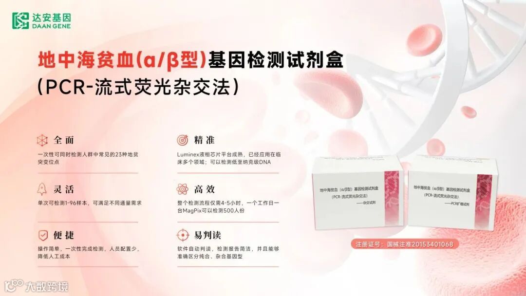 基于地中海贫血的临床背景和检测需求,达安基因早期研发上市了地中海贫血基因检测项目,该产品基于流式荧光杂交技术,一次性检测人群中常见的23种地贫突变位点,能够准确区分所有位点纯合、杂合基因型,全面精准、高效灵活,在地中海贫血的确诊、预防、治疗指导、优生优育等方面具有重要的应用价值。此外,针对于部分地区的流行特点,还开发了相关位点的检测试剂,进一步提高了地贫突变位点的覆盖率,为地贫防控提供更加全面的解决方案,敬请期待!