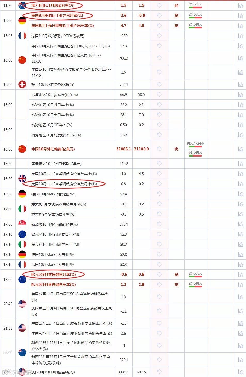 1、11:30澳大利亚至11月7日澳洲联储利率决定。