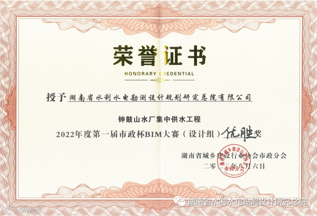 近日,由湖南省城乡建设行业协会主办,湖南省交通规划勘察设计院有限公司和广联达科技股份有限公司承办的湖南省第一届“市政杯”BIM应用技能大赛在长沙召开现场答辩会议。设计院公司参赛项目“钟鼓山水厂集中供水工程”荣获设计组优胜奖。