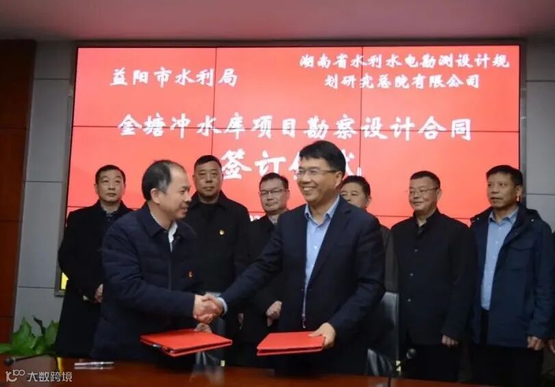 2022年3月22日上午,湖南资水金塘冲水库工程勘察设计合同签字仪式在我公司举行,益阳市水利局党组书记、局长周放鑫与我公司党委书记、总经理周新章出席仪式,并签订合同。