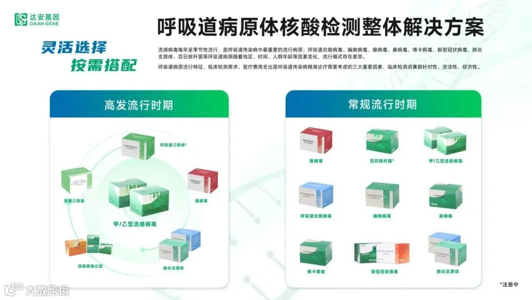 为了满足呼吸道病原体的临床诊疗需求,达安基因不断丰富该产品系列,从病原体流行特点、临床检测需求和医疗费用支出三个方面着手,形成了日臻完善的呼吸道病原体核酸检测整体解决方案,可根据诊疗需求进行灵活选择单检或组合检测,对于呼吸道感染性疾病的精准防控、诊断、提高治疗效率具有重要意义。
