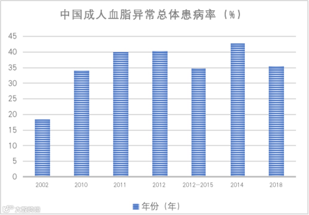 近几十年来,中国人群的血脂水平、血脂异常患病率明显增加,以高胆固醇血症的增加最为明显。2018年全国调查结果显示,≥ 18岁成人血脂异常总患病率为 35.6%。