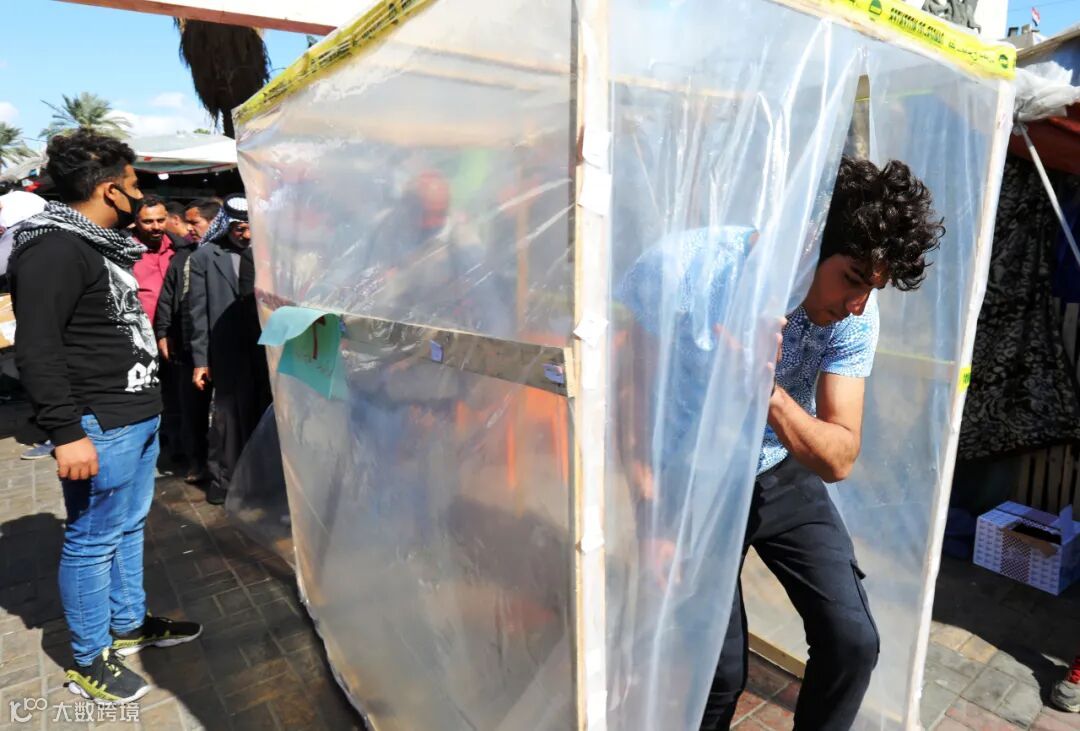 ▲3月2日,在巴格达解放广场,民众排队进入简易消毒房中消毒。新华社发(哈利勒·达伍德摄)