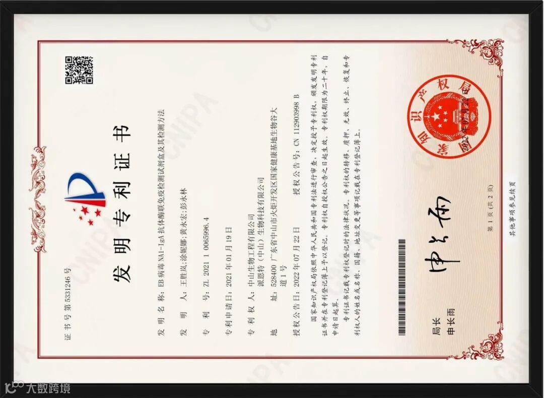 近期,广州达安基因股份有限公司(以下简称“达安基因”)下属全资子公司—中山生物工程有限公司(以下简称“中山生物”、“公司”)申请的两项EB病毒检测技术:“EB病毒NA1-IgA抗体酶联免疫检测试剂盒及其检测方法”、“EB病毒衣壳抗原IgA抗体酶联免疫检测试剂盒及其检测方法”相继获得国家知识产权局的发明专利授权。