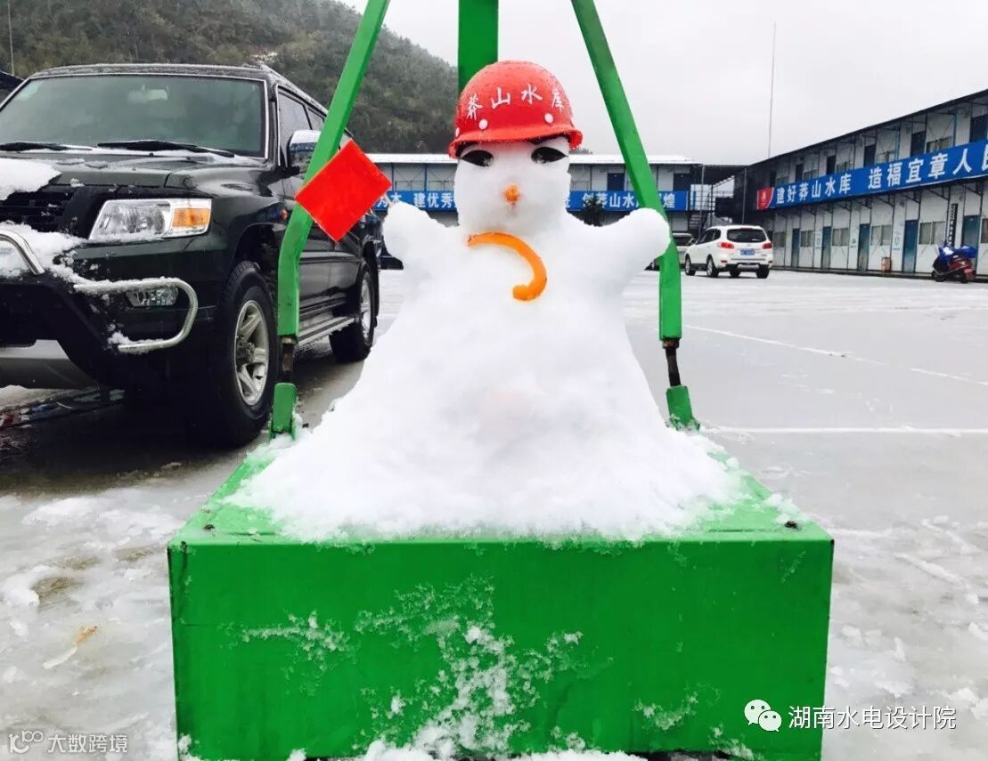 有几位员工在篮球架上堆起了雪人,并戴上了“莽山水库”的安全帽,以加强提示和提醒,为严肃的项目部增添了一抹青春活力的气息。