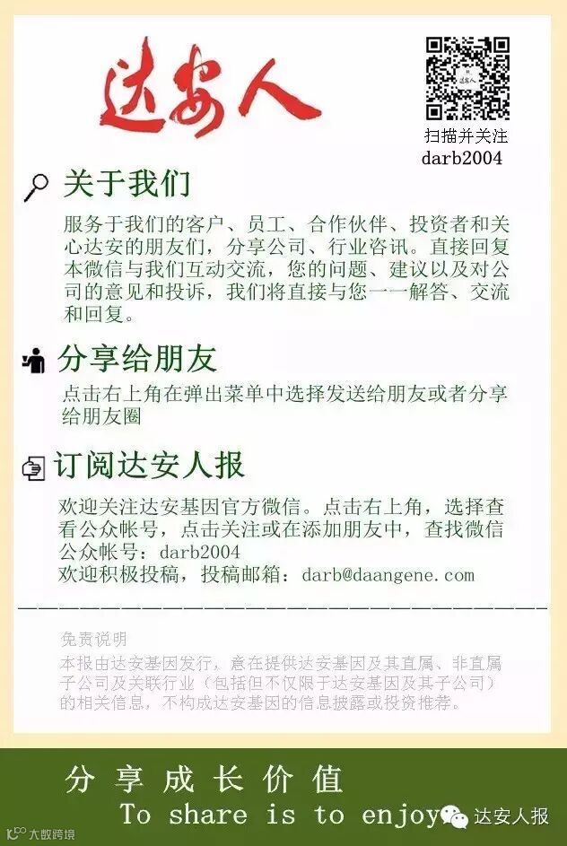 温馨提示:点击标题下方的蓝色小字,可快速关注“达安人报”,达安人报是上市公司达安基因(002030)的官方微信,关注后直接微信回复即可与公司互动对话,您咨询、关心的问题均可得到我们一对一的快速回复,千真万确哦!