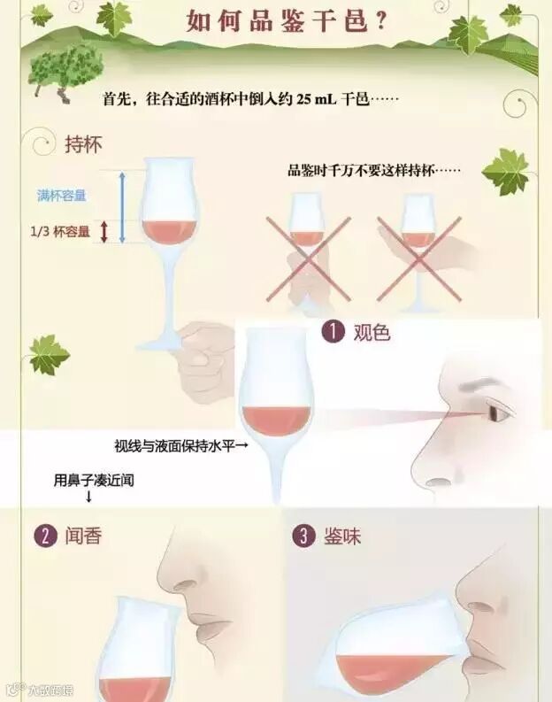 (3)鉴味:舌头的不同部位对干邑的感知不同,所以小撮一口后不要急于吞下,尽量让口腔不同部位感受到酒液,只要你用心无论是酸甜苦辣咸都可以感知出来,同时记得判断它是否圆润甘冽,是否柔软细腻,是否醇和香腴。当然,你可以选择吞下去或者吐出来,但无论怎样都要注意感受其余味长短和口感是否平衡等。