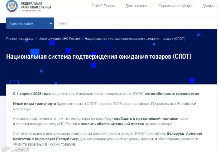 导读:俄联邦税务局 3 月 20 日官宣:国家待运货物确认系统(SPOT)4 月 1 日试点、7 月 1 日强制实施