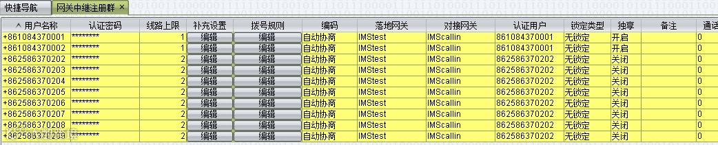 设置北京IMS账号+861084370001、+86084370002线路上限为1,开启独享模式,南京IMS账号+862586370202-+862586370209,线路上限为2,关闭独享模式。