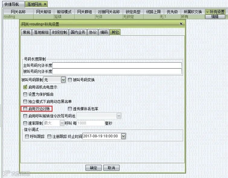设置方法:在对接方与落地方均使用 2.1.7.00 或更高版本的前提下,对接与落地双方可启用双边对账功能。对接方与落地方首先在自身 VOS 上的对方网关中的“补充设置 > 其他”选项中勾选 “启用双边对账”。