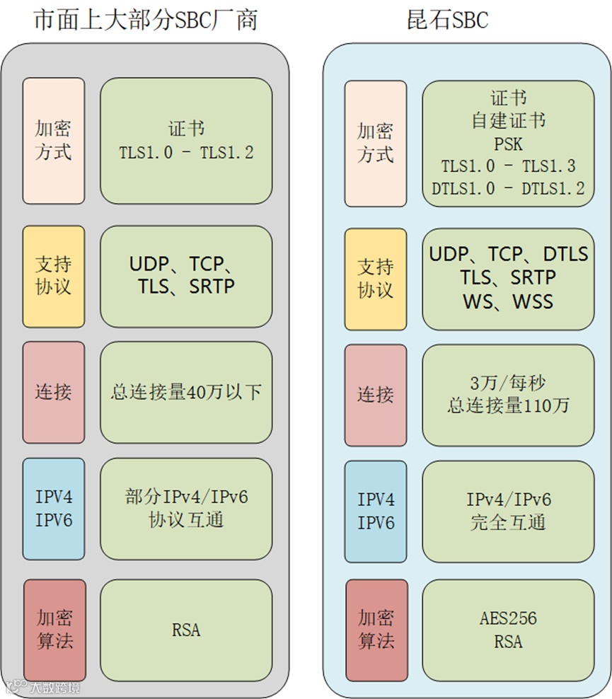 可以看到市面上绝大部分SBC厂商仅支持TLS加密协议,未支持DTLS。而在加密方式上大部分仅采用证书校验,却未支持传输效率更高的PSK模式。昆石SBC在信令语音加密处理性能上远超其他SBC厂家,致力于更全面,高效的为客户保障数据传输安全。