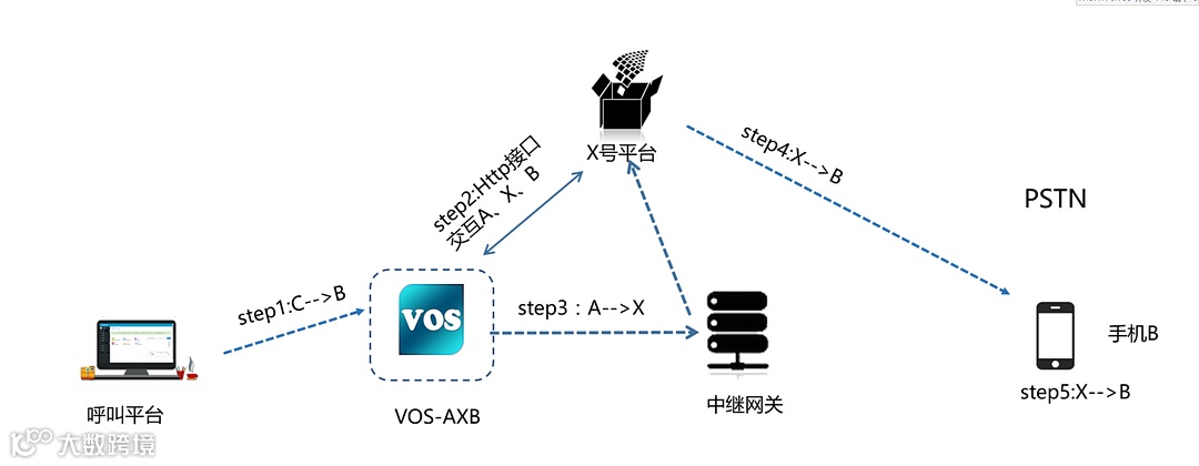 VOS系统自动将该路呼叫的主叫号码C改成A,被叫号码B改为X送至指定落地呼向X号平台。