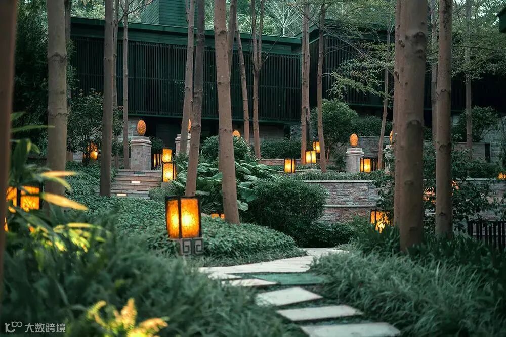 盛唐风格的建筑掩映在层峦叠嶂的群山和美丽的溪谷中,黛色屋顶在绿野中若隐若现,优雅的建筑线条与重彩的景观奇迹相映生辉。