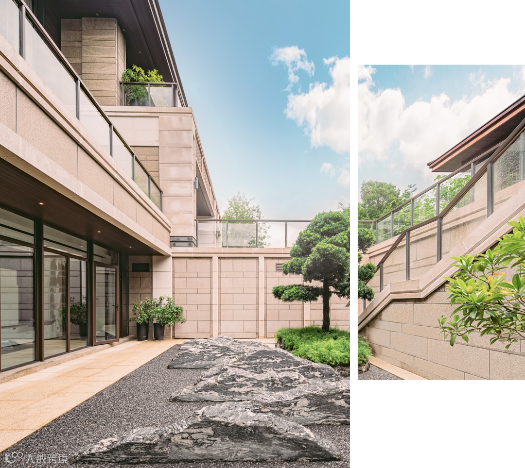 前后双庭院布置巧妙,景观文化感十足,松柏苍劲,雅石错落有致。