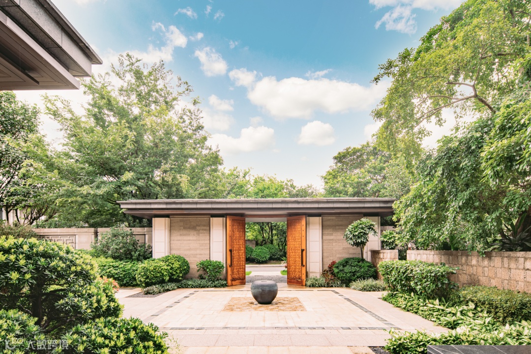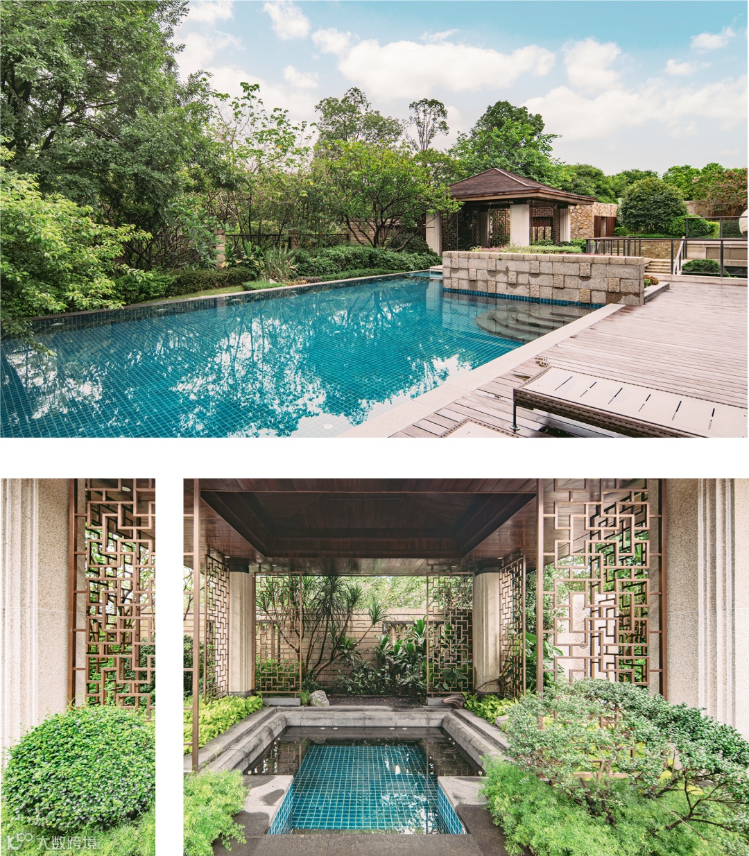 后院——后院便是被包裹在绿意中的泳池,与温泉泡池亭,形成十分放松的度假花园,私密感十足,与前院形成多层次的生活场景补充。