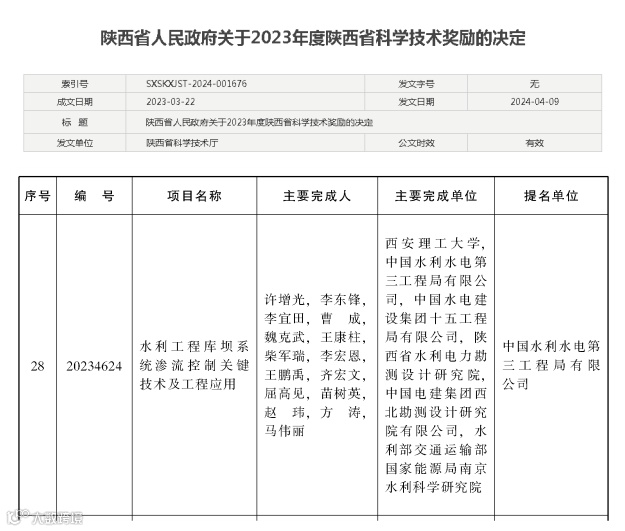 近日,陕西省人民政府公布了2023年度陕西省科学技术进步奖评选结果,我院联合西安理工大学、中国水利水电第三工程局有限公司等单位共同完成的“水利工程库坝系统渗流控制关键技术及工程应用”研究成果,荣获陕西省科技进步一等奖。