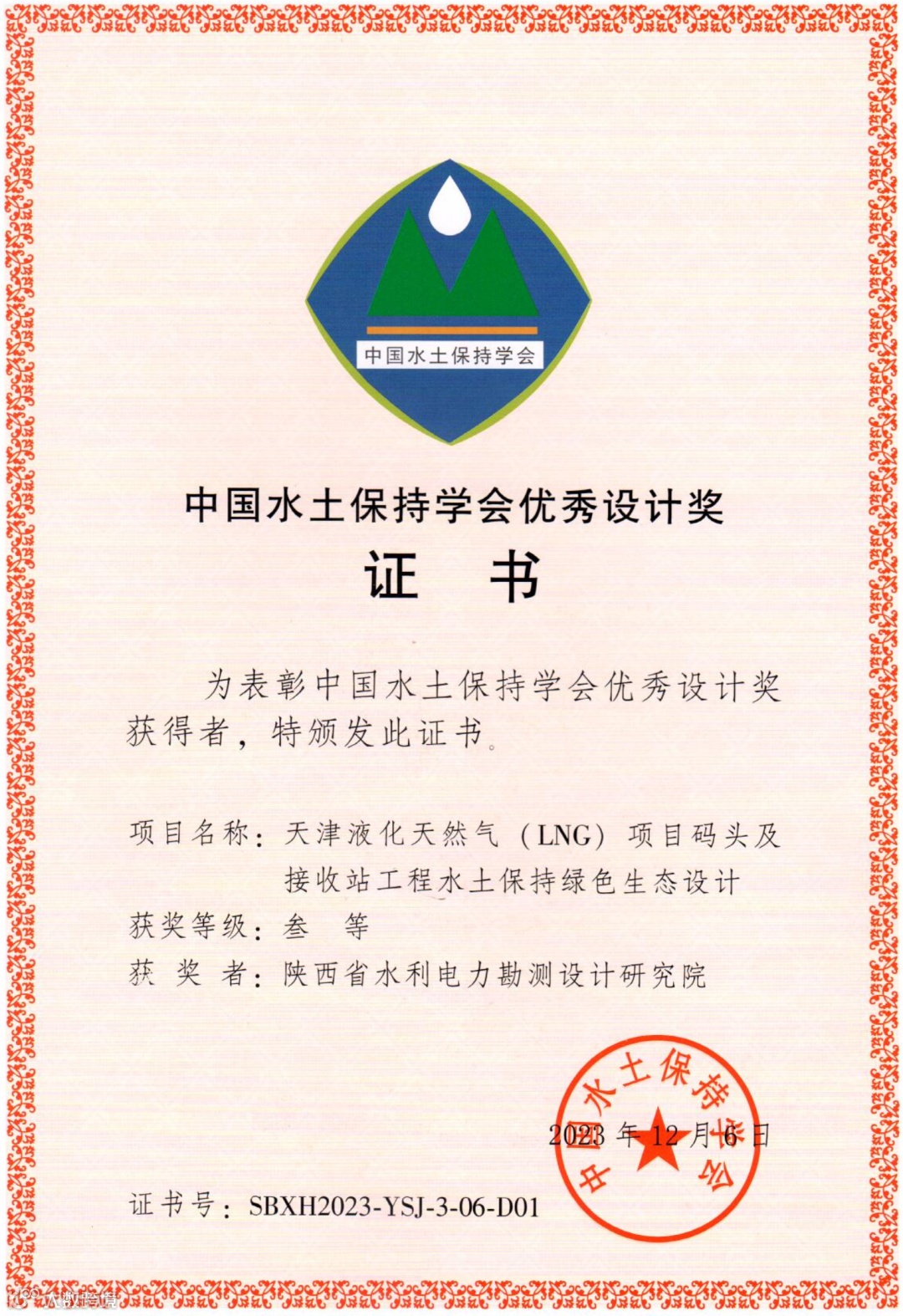 近日,由省水电设计院承担的《天津液化天然气(LNG)项目码头及接收站工程水土保持绿色生态设计项目》荣获第四届中国水土保持学会优秀设计三等奖。