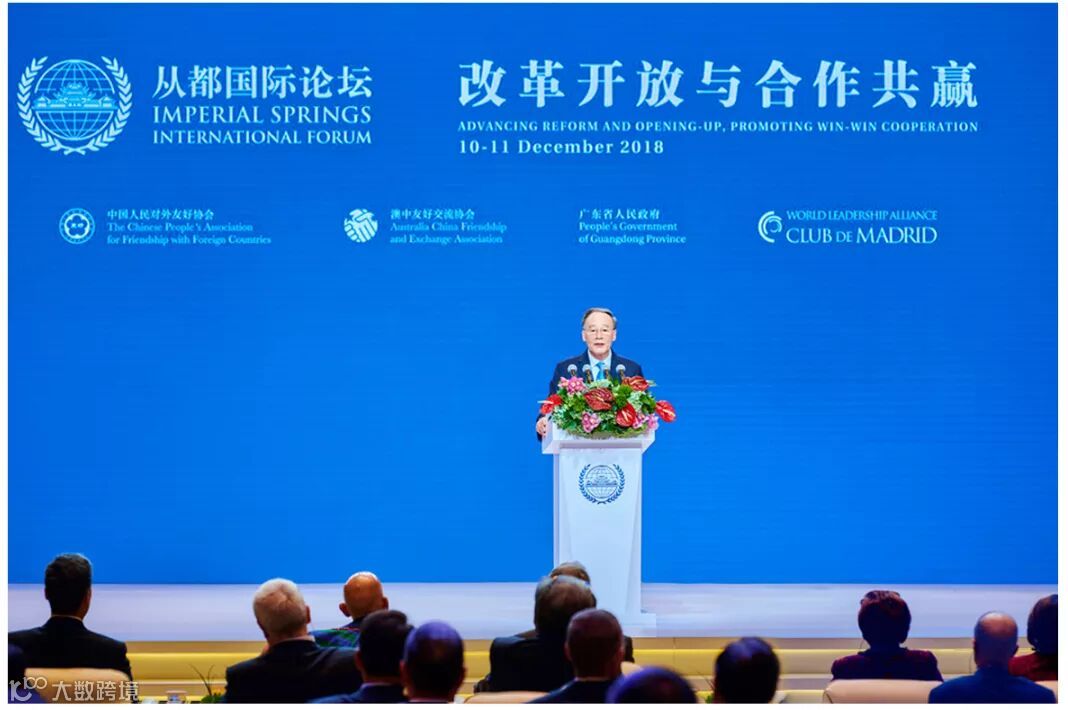 (上图)国家副主席王岐山出席2018“从都国际论坛”开幕式并做主旨发言