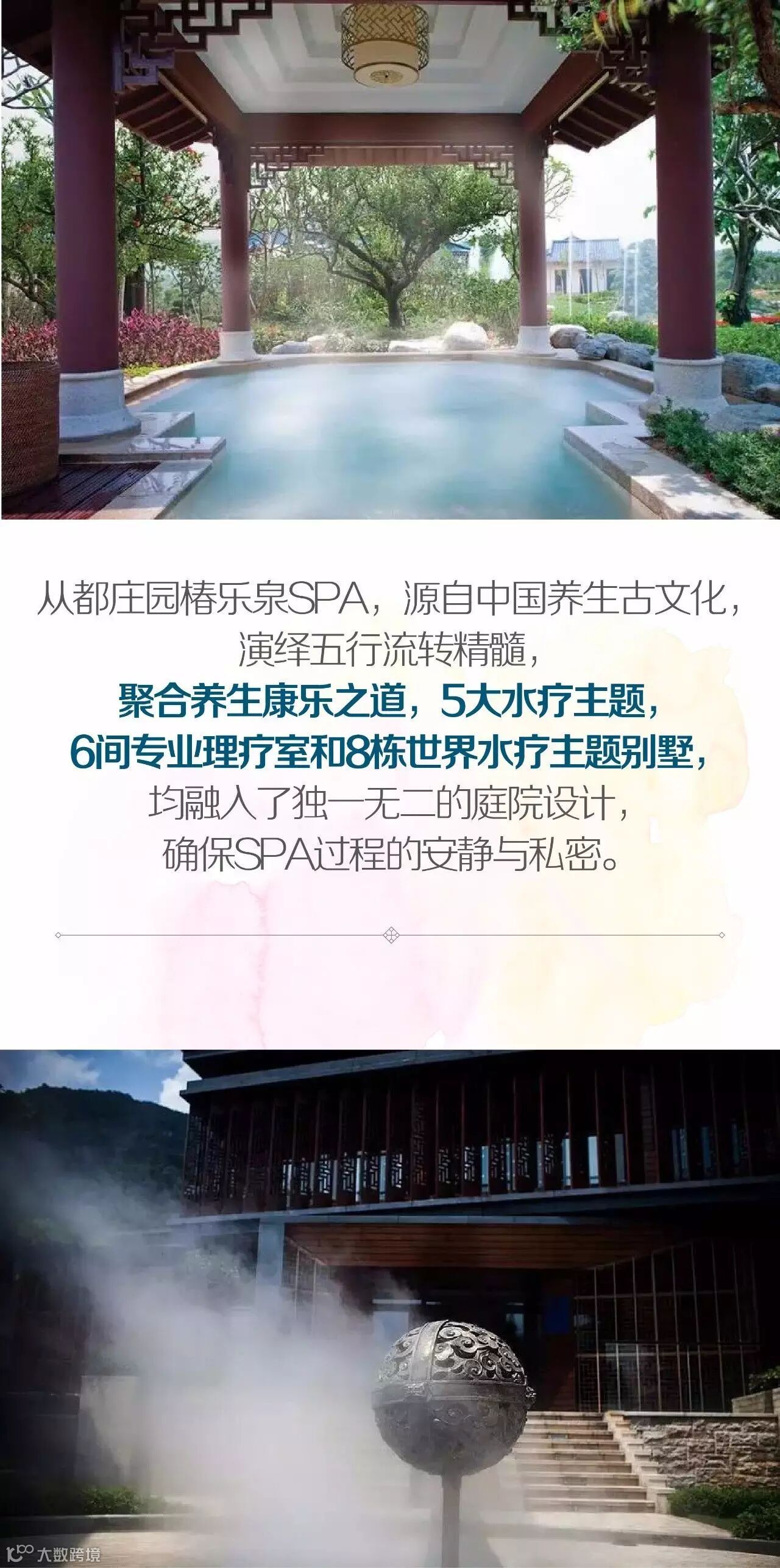 导读:从都庄园椿乐泉SPA,源自中国养生古文化,演绎五行流转精髓,聚合养生康乐之道,5大水疗主题,6间专业理疗室和8栋世界水疗主题别墅,均融入了独一无二的庭院设计,确保SPA过程的安静与私密。