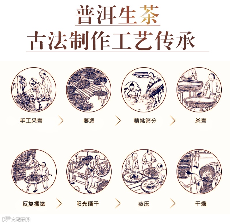 鲜叶采摘、摊凉、杀青、揉捻、晒青