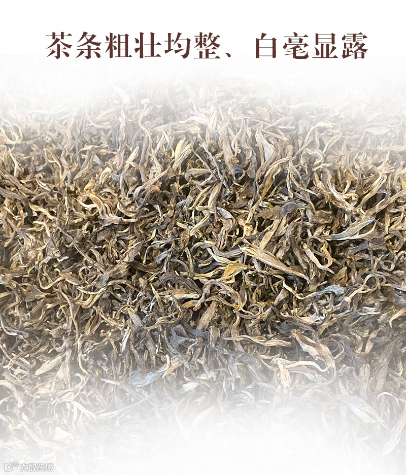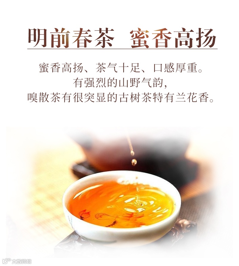 茶条粗壮均整、白毫显露,味浓回甘。茶汤半年以上显金黄透亮、蜜香高扬、茶气十足、口感厚重。有强烈的山野气韵,嗅散茶有很突显的古树茶特有兰花香。