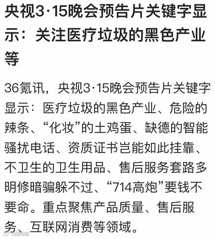 今年3.15重点聚焦产品质量、售后服务、互联网消费等领域