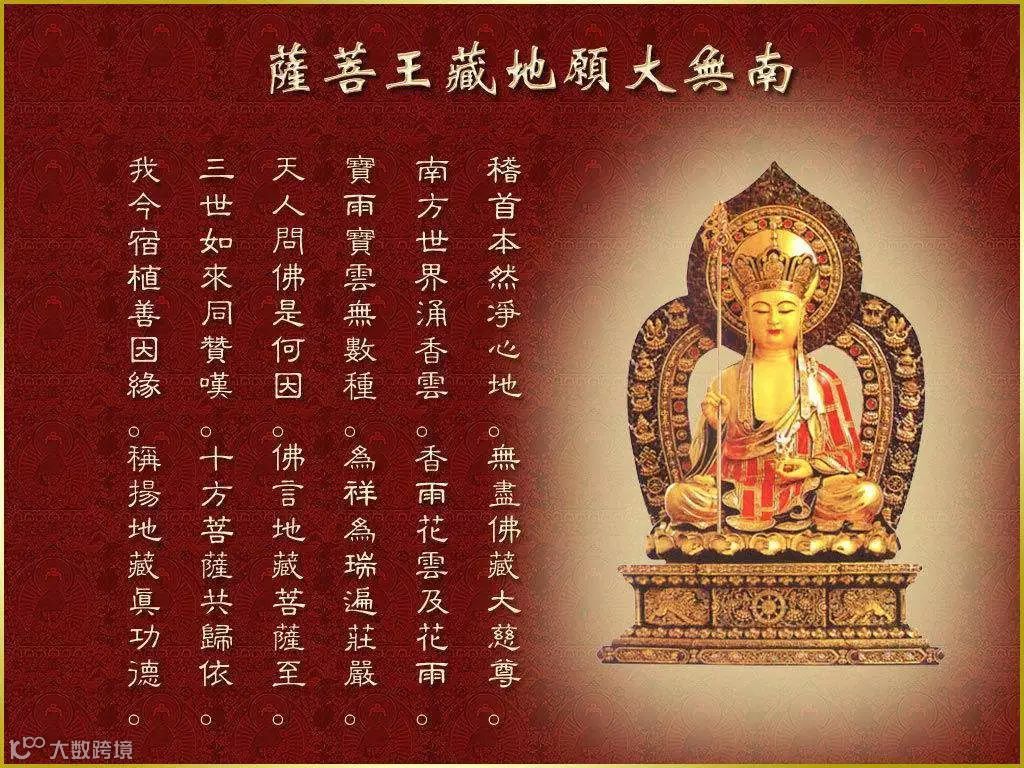 地藏菩萨是佛门中最重要的菩萨之一,其愿力无尽。所有的大菩萨都有广大的誓愿,都以普度众生为己任,都发愿:众生无边誓愿度,烦恼无尽誓愿断,法门无量誓愿学,佛道无上誓愿成。但地藏菩萨的誓愿,更是广大无边,他在因地修行时无数次从内心深处发愿: