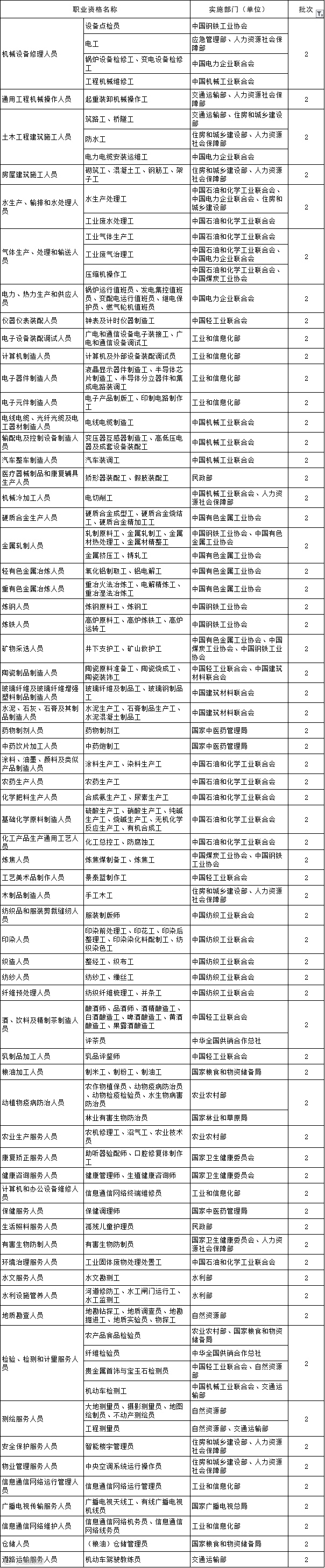 二、今年年底前,拟分批将水平评价类技能人员职业资格退出目录。人力资源社会保障部门和有关部门组织实施的14项职业资格(涉及29个职业)拟于9月30日前第一批退出。其他部门(单位)组织实施的66项职业资格(涉及156个职业)拟于12月31日前第二批退出。与公共安全、人身健康、生命财产安全等密切相关的职业(工种)拟依法调整为准入类职业资格。上述有关工作请于今年年底前完成(具体安排详见附件)。