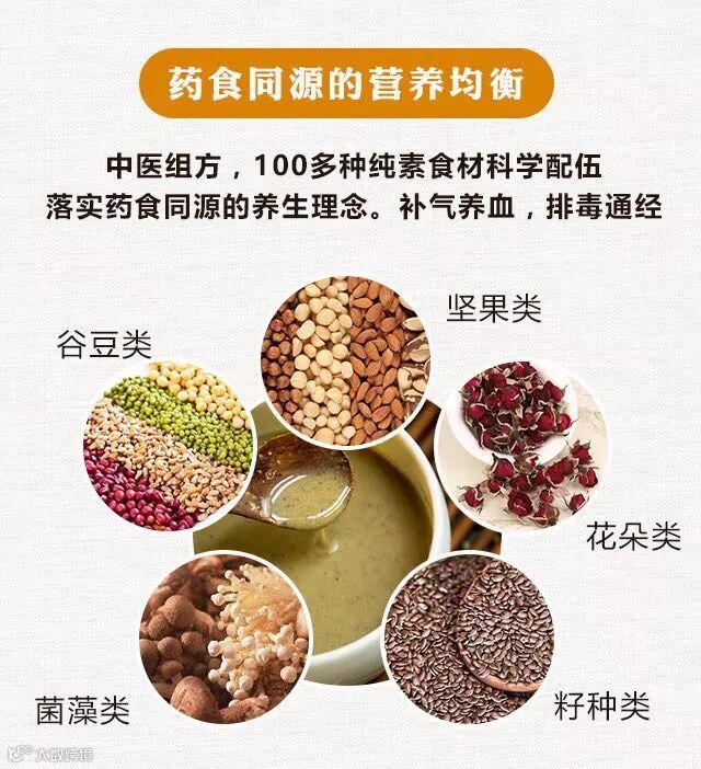 食材包括五谷杂粮,杂豆,大豆,各种坚果,籽种类,菌藻类,花朵类100多种,其中极多种为药食同源食材,完美诠释了“食材多样化”概念。