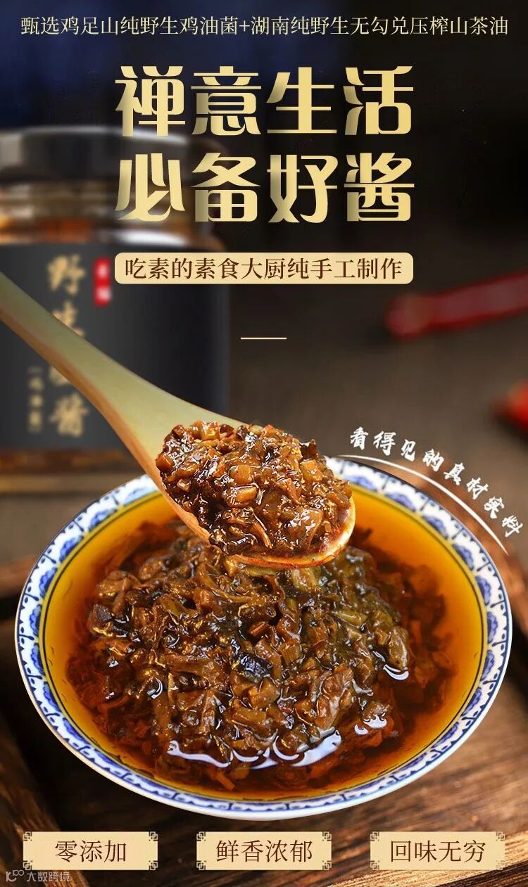 素猫野生菌皇酱(鸡油菌)是素猫联合广州素食学校,在疫情期间的专项研究成果,这款酱保留了素猫产品一惯的特色——纯手工、零添加、净素(无肉无蛋无奶无五辛),打破了素食食材只能做低端产品的传统观念。