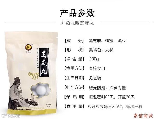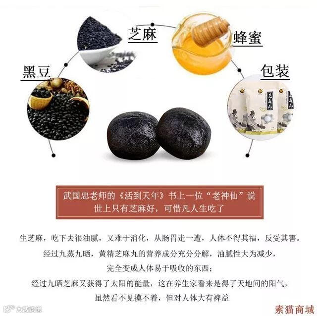 《本草纲目》称:“服黑芝麻百日能除一切痼疾。一年身面光泽不饥,二年白发返黑,三年齿落更出”。通俗地讲就是:黑芝麻蜜丸可补肾精,填脑髓,长肌肉,滋润五脏六腑,服至1年批复光泽,2年白发返黑,3年齿落更生,4年水火人精气神充足,5年行疾奔马,久服长寿。