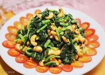 菠菜被誉为养颜佳蔬,能令人面色红润光彩照人。它对缺铁性贫血有改善作用。菠菜含有丰富的维生素及抗氧化素,能清理人体胃肠的热毒,还有养血、止血、敛阴、润燥的功效。因而可防治便秘,使人容光焕发。腰果中的脂肪成分主要是不饱和脂肪酸,有很好的软化血管的作用,它还含有丰富的油脂,可以润肠通便。并且具有很好的润肤美容的功效。经常食用有强身健体,提高机体抗病能力等作用。