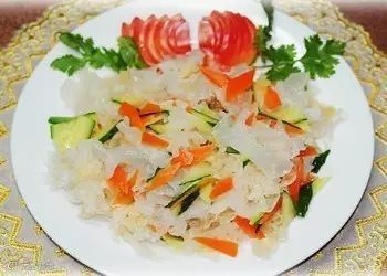 特点:此菜颜色鲜艳,胡萝卜、黄瓜脆嫩,银耳清淡鲜香。