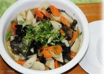 山药中含有皂甙、黏液质,有润滑,滋润的作用,故可益肺气,养肺阴,治疗肺虚痰嗽久咳之症;还有降低血糖的作用,是糖尿病人的食疗佳品;有效阻止血脂在血管壁的沉淀,能预防心血管疾病。取得益志安神、延年益寿的功效。黑木耳对于补铁有很好的功效。它比绿叶蔬菜中含铁量最高的菠菜高出20倍,因其含铁量高,可以及时为人体补充足够的铁质,所以黑木耳可做为一种天然的补血食品。胡萝卜含有大量胡萝卜素,有补肝明目的作用,可治疗夜盲症;还含有植物纤维,吸水性强,在肠道中体积容易膨胀,是肠道中的「充盈物质」,可加强肠道的蠕动,从而利膈宽肠,通便防癌等功效。
