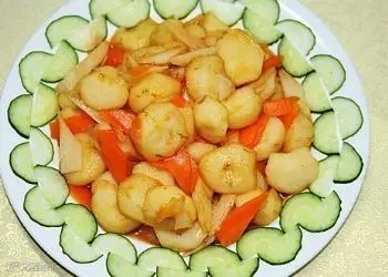 特点:此菜脆嫩,红白相间,微甜鲜香适口。
