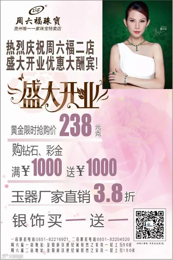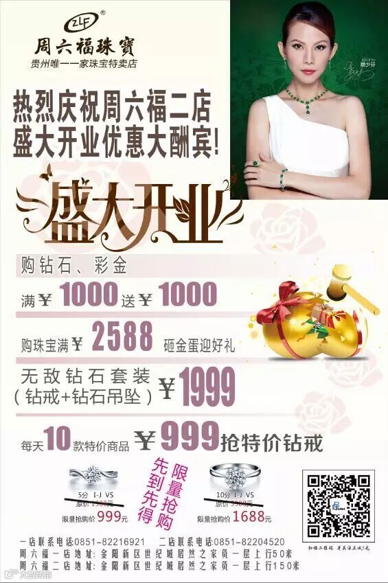 导读:热烈庆祝周六福珠宝二店盛大开业!天天特价,月月优惠!好礼多多!
