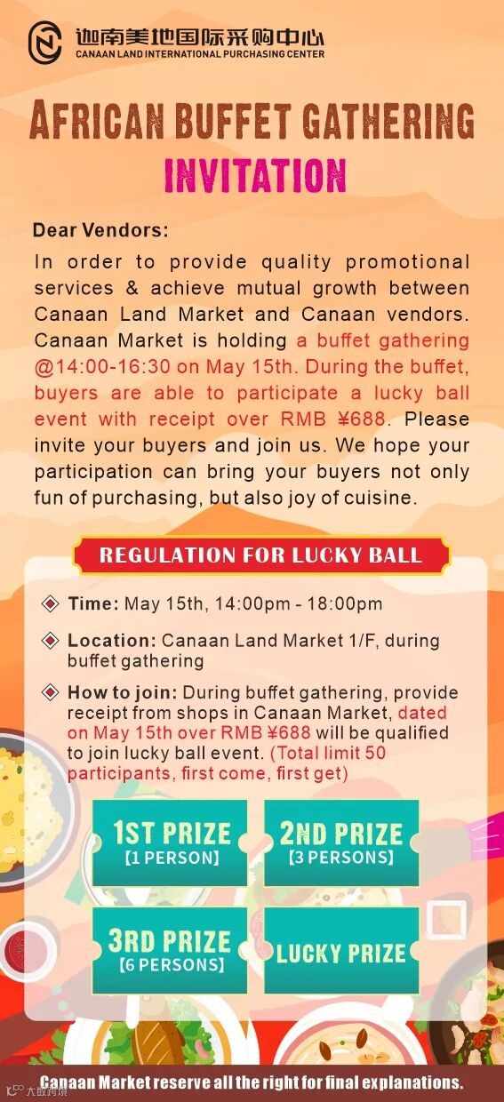 当天消费满688元以上,可凭采购单据前往迦南自助餐活动现场领取号码牌找专属工作人员进行抽奖。(仅限50个抽奖名额,每人只能抽一次。)
