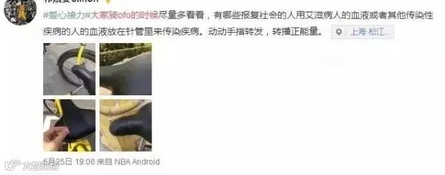 5月底,网上流传图片称,有人在一辆共享单车的坐垫上找到一根针,似有人故意为之。“骑车的时候请注意查看,有些艾滋病患者把自己的血染到针头上,要是被扎到你就被感染了。”