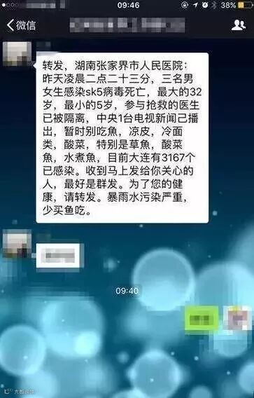 社交网络流传一则消息:昨天凌晨二点二十三分,三名男女生感染SK5病毒死亡,最大的32岁,最小的5岁,参与抢救的医生已被隔离,中央1台电视新闻已播岀,暂时别吃鱼类、酸菜,特别是草鱼,酸菜鱼,水煮鱼。“新型病毒”来袭,引发一些网民恐慌。
