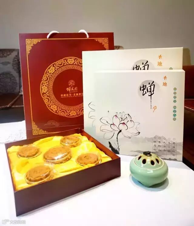 月饼设计共为五款,一大四小,每款一圣地名,寓圣地特产,悟佛心禅意,觉菩萨慈悲精神,禅意悠然。