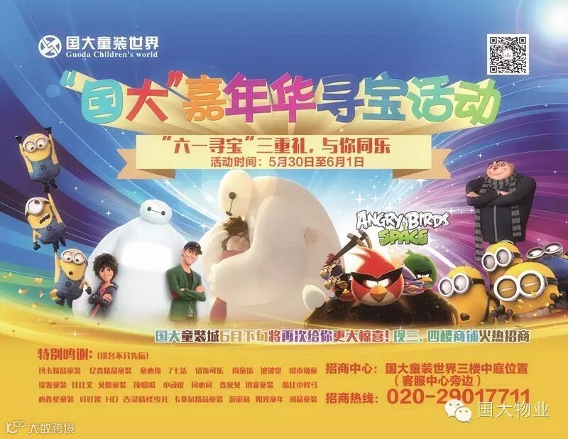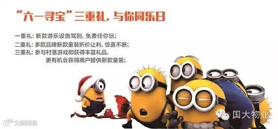 5月30日至6月1日来【国大童装世界】大白、小黄人、愤怒的小鸟将在现场陪你玩转“六、一”儿童节,届时亲临现场还获得神秘礼品一份。