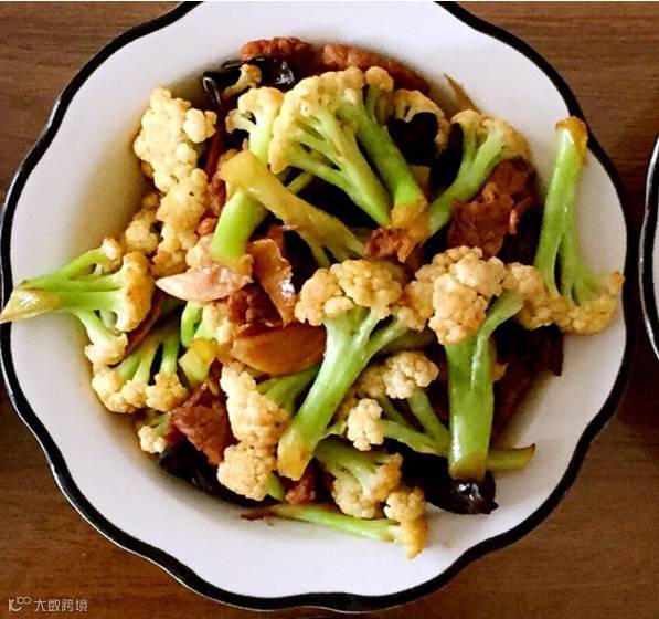 2、热锅下油,下姜末爆香,加入飞水后的西兰花,偶尔翻炒使其受热均匀后加入木耳继续翻炒,上盘。