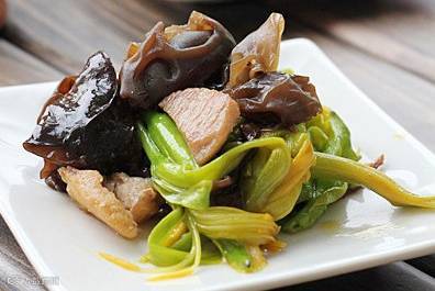 4、锅内油烧热,下青椒片炒香,下泡发好的木耳和山药,不停翻炒,待木耳发出噼叭声,加入盐翻炒一会,即可。