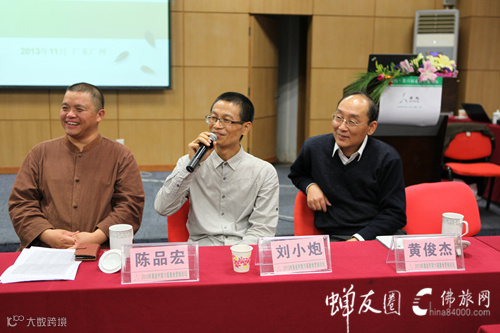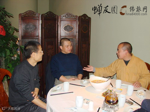 (左) 怡新素食总经理刘小炮、(中)蝉友圈CEO陈品宏、(右)疏山寺住持体明法师 2009年于广州怡新素食馆