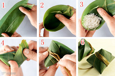3、上部的粽叶向下折,直到完全盖住开口为止。