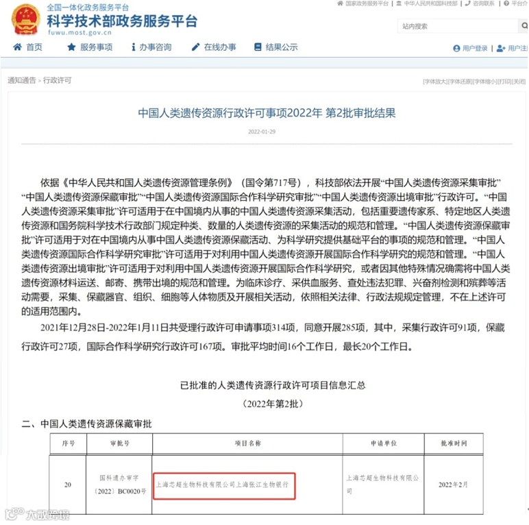 由国家科技部审批,上海芯超生物科技有限公司上海张江生物银行(国家中心细胞库)成功获批“中国人类遗传资源保藏审批”行政许可项目(国科遗办审字2022 BC0020号)。这是国家中心细胞库继2019年首次“中国人类遗传资源保藏审批”行政许可项目获批后,再次获得此项国家级行政许可资质批准。