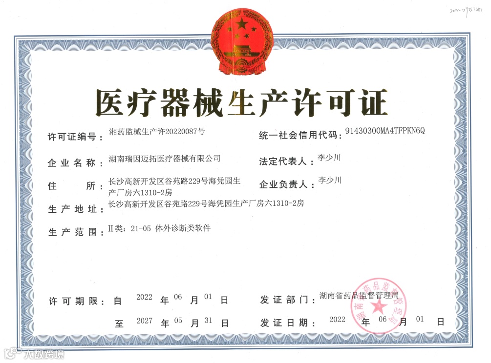 2022年6月1日,湖南瑞因迈拓医疗器械有限公司获湖南省药品监督管理局颁发Ⅱ类:21-05体外诊断类软件医疗器械生产许可证。