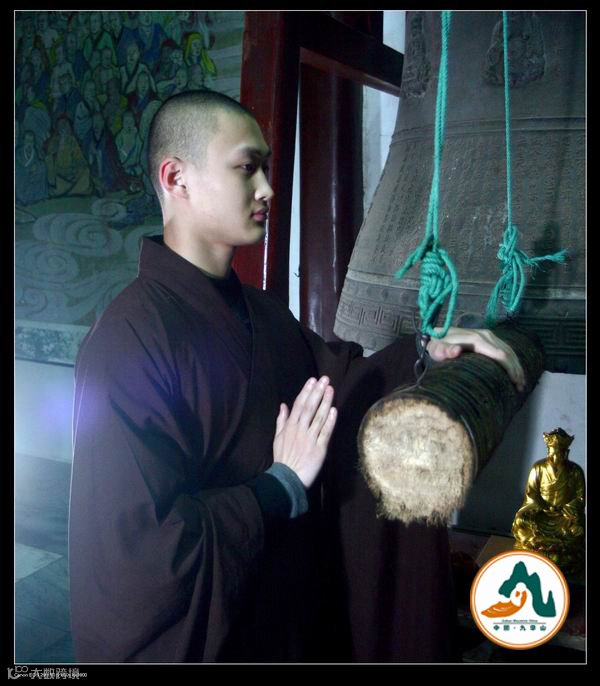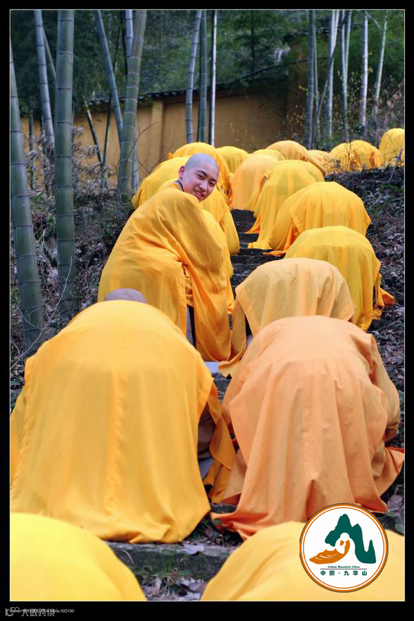 图 片:九华山佛学院学僧举行朝山活动,一步一头朝拜地藏王菩薩,玩皮的小师付忙中偷闲,回眸一笑。