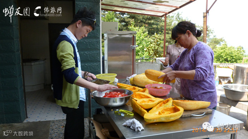 素食厨师小天在寺院帮阿姨切菜(摄于2014年五一九华山朝圣)
