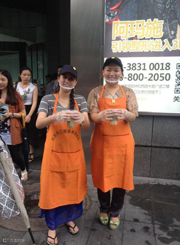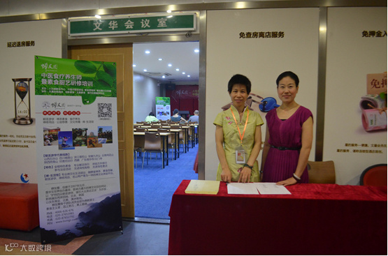班主任善燕与接待天使老学员王丽在欢迎新学员的到来